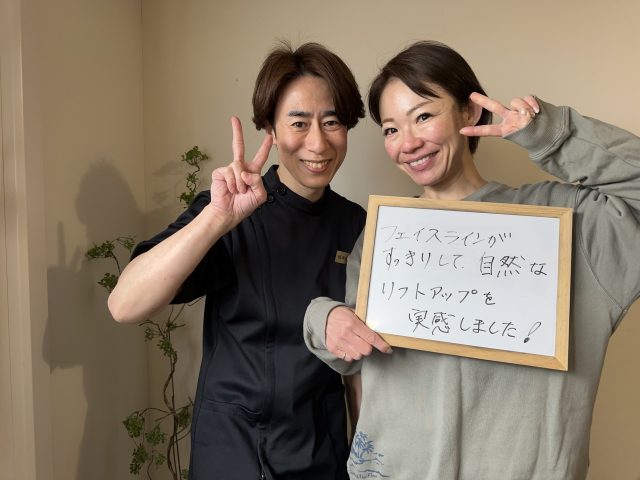 施術後はフェイスラインがすっきりし目元のシワが気にならなくなり頬の位置が上がってるのがはっきりとわかってともかくびっくり!!本当にすぐに効果が実感出来たのであまりの嬉しさで施術後、榎本先生に「本当にすごい!!」としつこい位言ってしまいました。