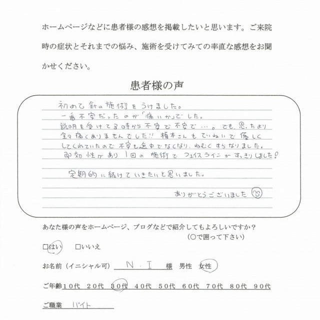 気になっていたほうれい線も浅くなってきているのが自分でもわかります。施術後はむくみも取れ翌日の化粧のりがとてもいいので水素美容鍼を初めて良かったと思います。