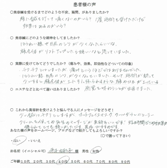 A:美容整形をするのは怖いので美容鍼ですこしでもリフトアップできればと思っていました。